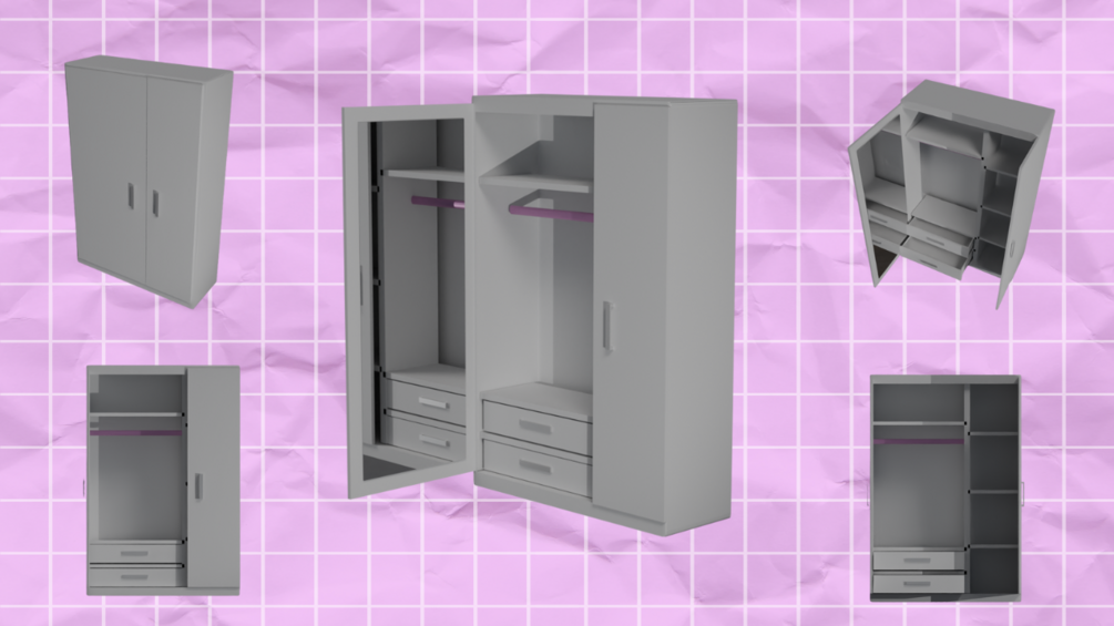 Simple wardrobe 3D low-poly model with mirror on the door, shelves and two drawers.